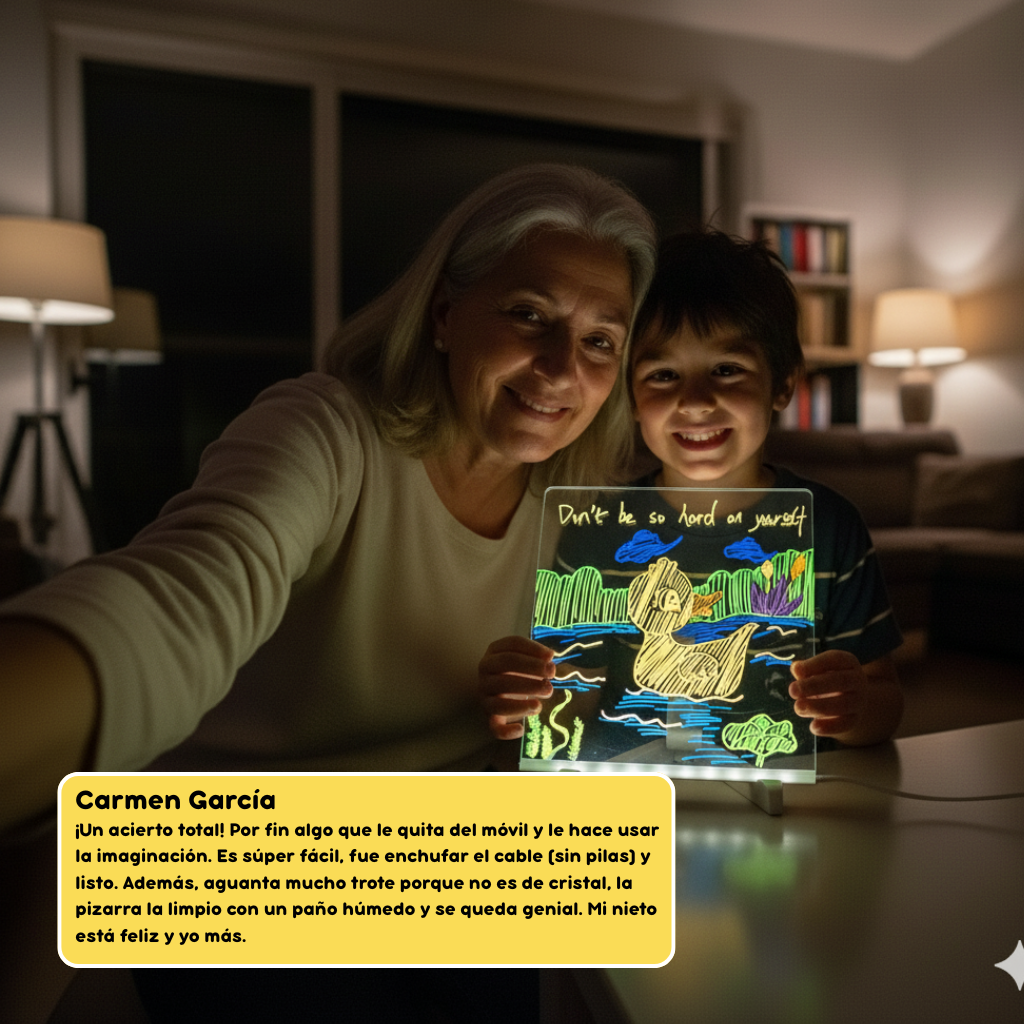 Como pedagoga, la preocupación N°1 de los padres es el tiempo excesivo frente a las pantallas. Buscamos alternativas que no solo entretengan, sino que desarrollen habilidades. Por eso recomiendo la Pizarra Mágica LED Vively.